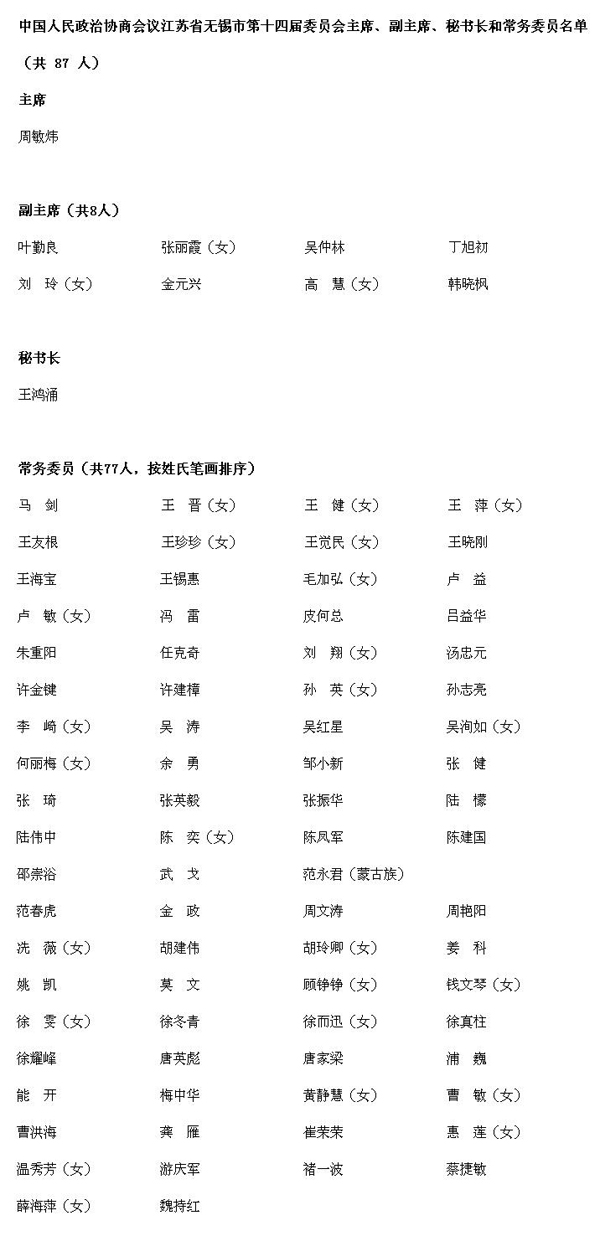 無錫市政協(xié)十四屆一次會議2月16日下午進(jìn)行了選舉,選舉產(chǎn)生無錫市第十四屆政協(xié)主席、副主席、秘書長和常務(wù)委員。大會選舉周敏煒為無錫市第十四屆政協(xié)主席,葉勤良、張麗霞、吳仲林、丁旭初、劉玲、金元興、高慧、韓曉楓為副主席,王鴻涌為秘書長。
