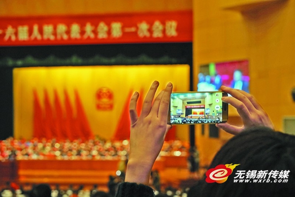 新媒體記者現(xiàn)場(chǎng)拍圖,“秒傳”后臺(tái)及時(shí)編發(fā),向市民傳遞大會(huì)盛況?!?方洲 攝)