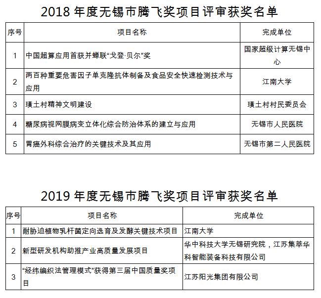 附件:2018 年度、2019 年度無錫市騰飛獎(jiǎng)項(xiàng)目評(píng)審獲獎(jiǎng)名單