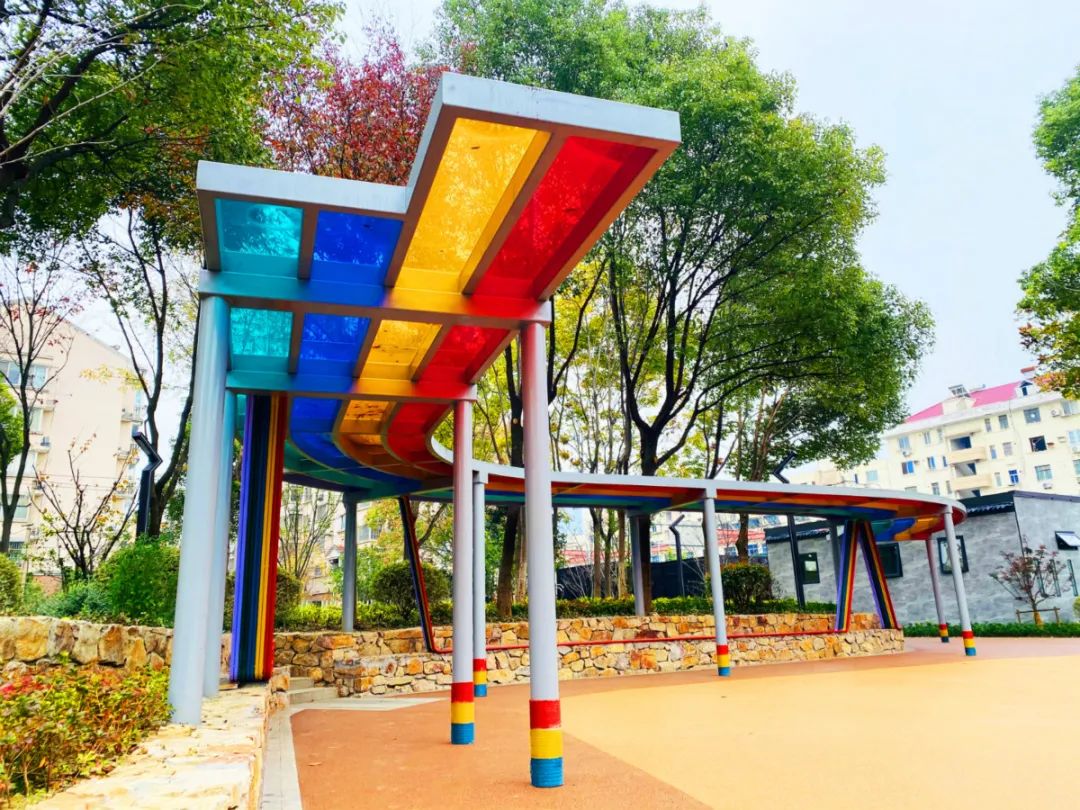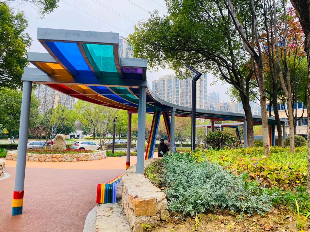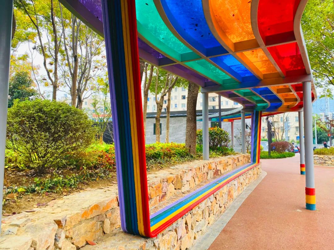 游園中心設(shè)置一組由七種顏色組成的鋼結(jié)構(gòu)彩虹廊架,廊架長約20米,兼具休憩功能。