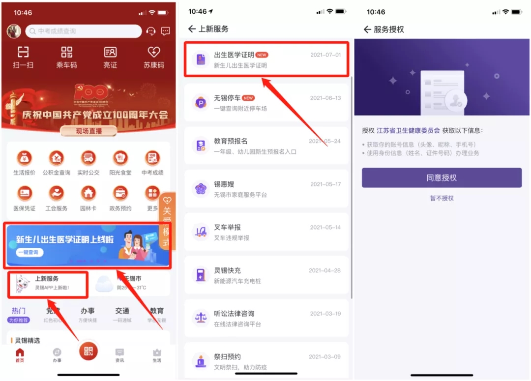 孩子母親或父親實(shí)名登錄“靈錫”APP ,在點(diǎn)擊APP首頁(yè)【出生醫(yī)學(xué)證明】海報(bào)頁(yè) ,或者點(diǎn)擊APP首頁(yè) —【上新服務(wù)】—【出生醫(yī)學(xué)證明】版塊進(jìn)行查詢;
