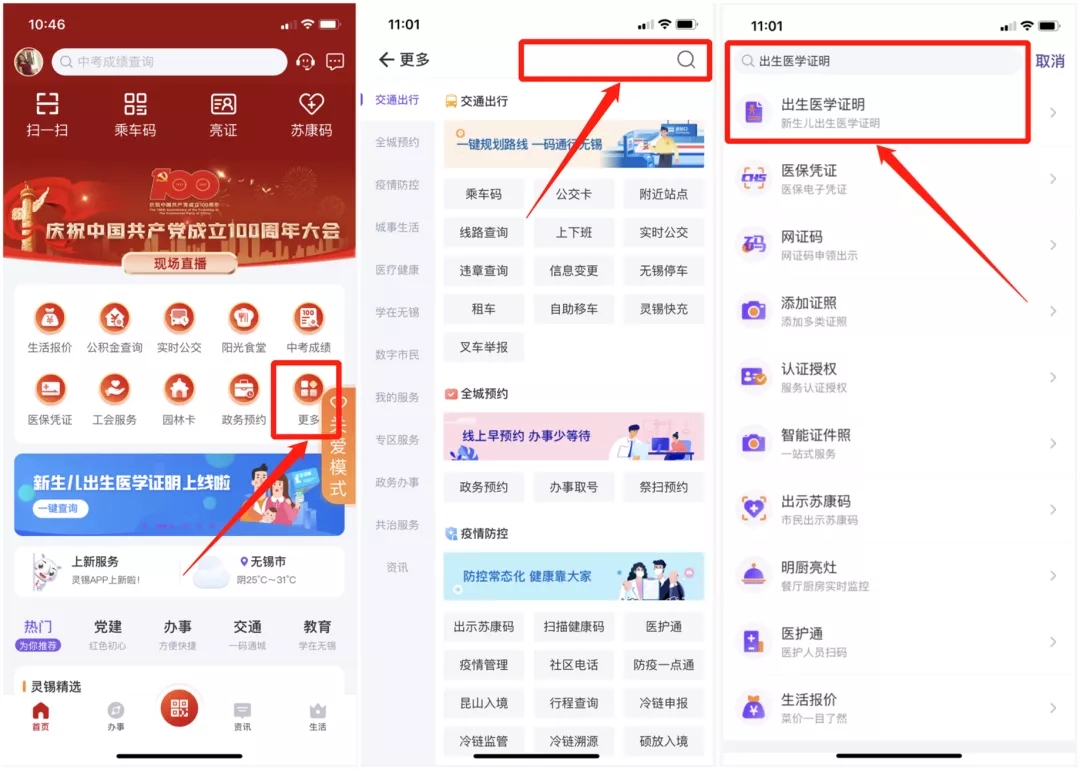 也可點(diǎn)擊APP首頁(yè) —【更多】,直接在搜索欄輸入【出生醫(yī)學(xué)證明】進(jìn)行查詢。