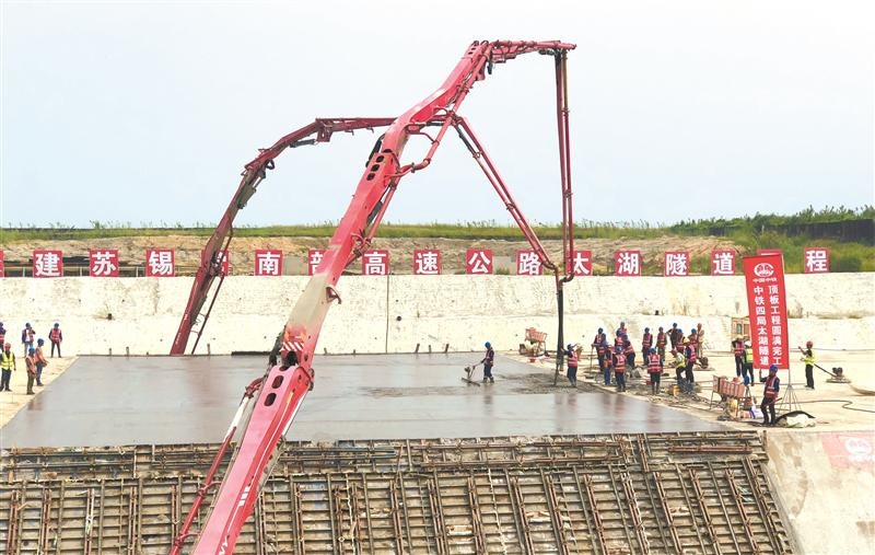 伴隨著28名施工人員和泵車長達20個小時的連續(xù)作業(yè),澆筑、攤鋪反復(fù)多次,約1750立方米的混凝土澆筑至太湖隧道南泉段第6倉頂板上。昨天上午11點左右,最后一方混凝土從罐車澆向作業(yè)面,太湖隧道南泉段主體結(jié)構(gòu)竣工,長達10.79公里的湖底隧道實現(xiàn)南泉段全“閉合”。蘇錫常南部高速公路全線預(yù)計年內(nèi)可交工投用。