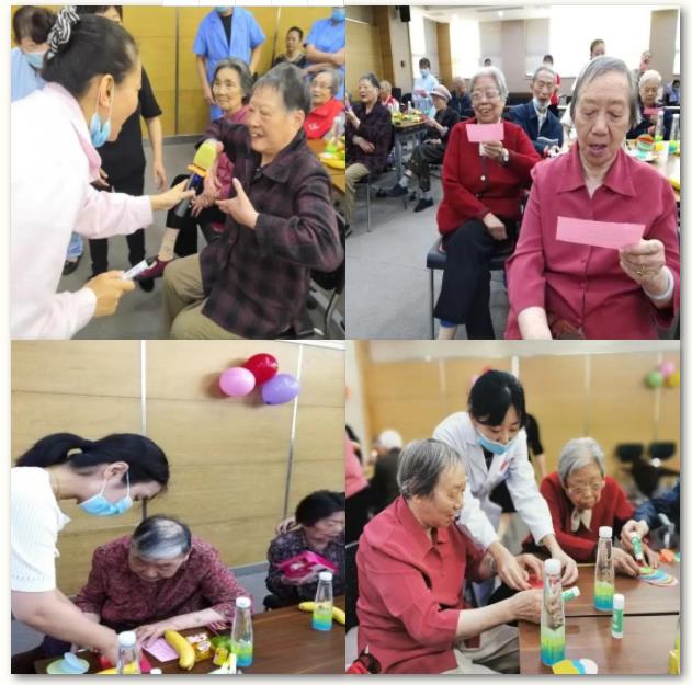 主持人宣布文娛表演開始,一個(gè)個(gè)精彩紛呈的節(jié)目就上演了。開場(chǎng)舞《蘭花草》展現(xiàn)了護(hù)理員和保潔員熱愛(ài)生活、熱愛(ài)運(yùn)動(dòng)的精神面貌,她們的舞蹈令臺(tái)下的老人們仿佛回到了青蔥歲月,激發(fā)了老人們的熱情?! ‰q笾陞s不服老,老人們隨即表演了精彩的節(jié)目。在管理老師和護(hù)理員的帶領(lǐng)下,他們用手語(yǔ)舞《萬(wàn)疆》和歌曲《紅梅贊》表達(dá)了對(duì)祖國(guó)的熱愛(ài)和對(duì)幸福生活的滿足。“你就是我的天使,保護(hù)著我的天使,從此我再也沒(méi)有憂傷……”,殘疾人托養(yǎng)中心的折翼天使們?cè)谏绻さ膸ьI(lǐng)下,組成了一個(gè)“夢(mèng)想海星”樂(lè)隊(duì),他們用甜美的歌聲和節(jié)奏明快的鼓聲給老人們送上節(jié)日的祝福!活動(dòng)中還穿插了“我畫你猜”小游戲和“七彩燈籠”手工制作,讓老人們動(dòng)手又動(dòng)腦,增加活動(dòng)的參與度。就像歌中所唱的“最美不過(guò)夕陽(yáng)紅”一樣,讓老人們?cè)陴B(yǎng)老院真正過(guò)上“老有所養(yǎng),老有所依,老有所樂(lè),老有所安”的幸福晚年生活。