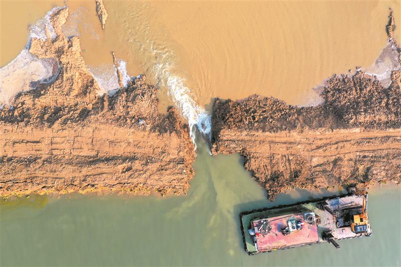 昨天上午8點(diǎn),太湖隧道南泉段施工現(xiàn)場(chǎng)一片繁忙。隨著挖機(jī)揮動(dòng)鐵臂挖開(kāi)圍堰,隧道南側(cè)出現(xiàn)了一處入水口,汩汩湖水從太湖流入圍堰內(nèi)。中鐵四局太湖隧道項(xiàng)目部工程部部長(zhǎng)何杰紅介紹,本次回水為隧道第7倉(cāng)至第10倉(cāng),回水量約90萬(wàn)立方米,預(yù)計(jì)回水時(shí)長(zhǎng)約48小時(shí)。此次回水后將新增1.5公里的隧道主體處于水面以下,隧道整體“潛入”湖底。