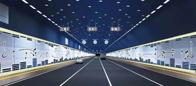在科技的賦能下,隧道設(shè)置了智能視覺系統(tǒng)和洞口距離提示特色標(biāo)志,側(cè)墻用藍(lán)、黃、綠三種色帶裝飾元素,隧道頂部交替設(shè)置有三處“藍(lán)天白云”和“夜晚星空”、LED可變景觀帶,不僅美觀,還能有效緩解駕駛員長時(shí)間在密閉空間中行車的緊張和壓抑情緒。