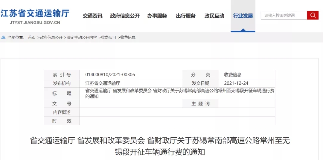 省交通運輸廳 省發(fā)展和改革委員會 省財政廳關(guān)于蘇錫常南部高速公路常州至無錫段開征車輛通行費的通知