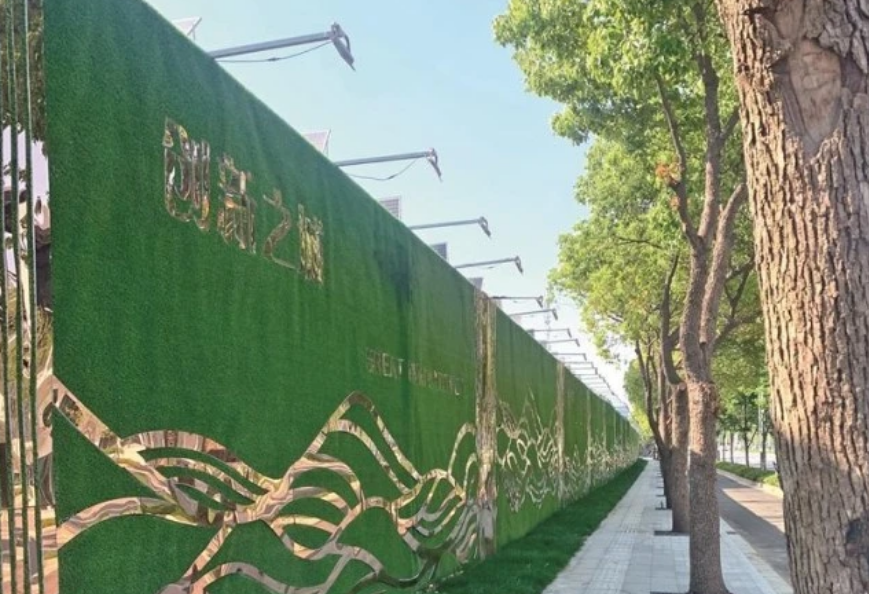 5米高的綠植圍擋上,以寫意風(fēng)格裝飾了地鐵列車元素和心跳元素,圍擋頂端外側(cè)布設(shè)照明燈探出半空,內(nèi)側(cè)則安裝一排降塵、除霾、增氧噴淋。這個(gè)猶如街心花園的地方,其實(shí)是位于貢湖大道和隱秀路口的無錫醫(yī)療健康產(chǎn)業(yè)園項(xiàng)目工地。