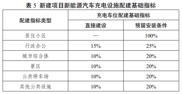 3.嚴(yán)格充電設(shè)施配建標(biāo)準(zhǔn)。新建居住社區(qū)要確保固定車位100%建設(shè)充電設(shè)施或預(yù)留安裝條件。預(yù)留安裝條件時須將管線和橋架等供電設(shè)施建設(shè)到車位以滿足直接裝表接電需要。新建城市綜合體、公共停車場等預(yù)留不低于10%比例的新能源汽車充電停車位。為適應(yīng)新能源汽車發(fā)展趨勢,滿足充電設(shè)施需求,新建項目直接建設(shè)充電車位比例以及預(yù)留安裝條件車位比例如下表: