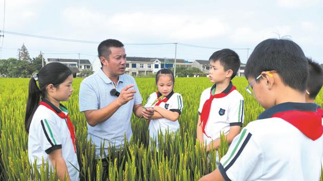 程雪峰也先后獲得全國農(nóng)機(jī)使用一線“土專家”、江蘇省勞動模范、江蘇省鄉(xiāng)土人才“三帶”能手、無錫市最美新型青年農(nóng)民等稱號。但在他看來,這些榮譽(yù)都不如一聲“米哥”來得親切實在。由于從事大米產(chǎn)業(yè)較早,很多人都稱程雪峰為“米哥”,叫他老婆“米嫂”,有了“米哥”“米嫂”,就有了“米娃農(nóng)學(xué)院”。首批“國慶稻”開鐮收割時,“米娃農(nóng)學(xué)院”共建單位之一江陰市長壽實驗小學(xué)的孩子們也來到田間地頭體驗了豐收的喜悅。通過參觀收割場景、小小講解員講解“米的一生”、制作飯團(tuán)等,孩子們更直觀、深入地親近土地,了解農(nóng)耕文化。“‘米娃農(nóng)學(xué)院’一年四季有插秧節(jié)、玉米節(jié)、豐收節(jié)等很多農(nóng)事活動,我們把課堂延伸到田間地頭,讓孩子們感受農(nóng)耕文化的同時,也感受到我們現(xiàn)代農(nóng)業(yè)天翻地覆的改變。”程雪峰說。
