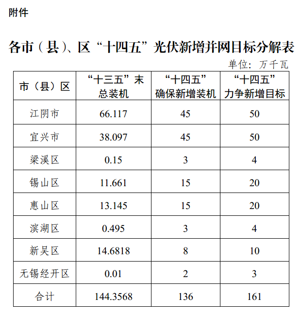 附件:各市(縣)、區(qū)“十四五”光伏新增并網(wǎng)目標(biāo)分解表