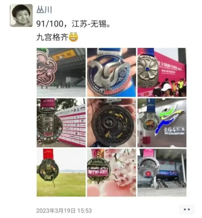 拿到2023無錫馬拉松的獎牌之后,叢川提著它拍了一張照片,發(fā)了個朋友圈:“九宮格齊”。