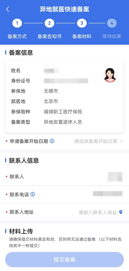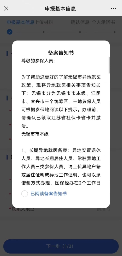 第三步:填寫備案信息和聯(lián)系人信息。進(jìn)入此步驟后的操作,與無錫微信公眾號(hào)辦理相同,請(qǐng)參閱無錫醫(yī)保微信公眾號(hào)辦理異地就醫(yī)之第六、第七、第八步。