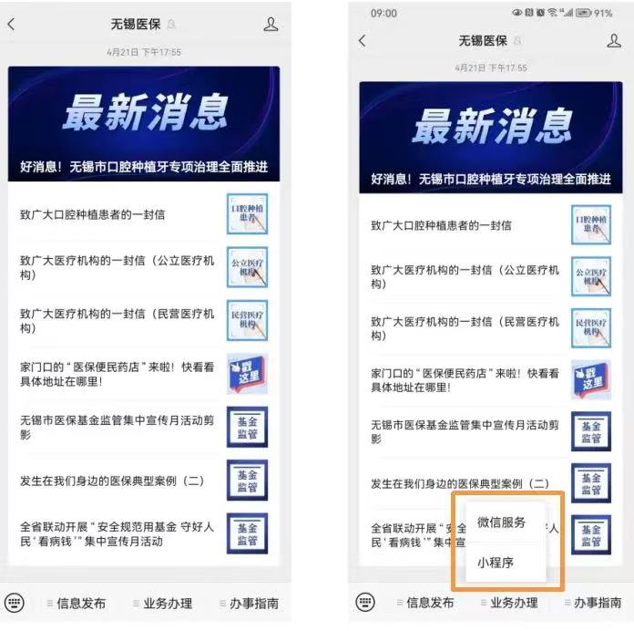 第一步:關(guān)注“無錫醫(yī)保”微信公眾號(hào),點(diǎn)擊“業(yè)務(wù)辦理”,選擇“微信服務(wù)”,實(shí)名注冊(cè)賬戶后登錄;