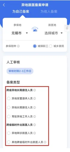 第三步:選擇參保地為無錫市,參保險(xiǎn)種(城鎮(zhèn)職工/城鄉(xiāng)居民),按需選擇備案類型(有5個(gè)選項(xiàng)可供選擇)。