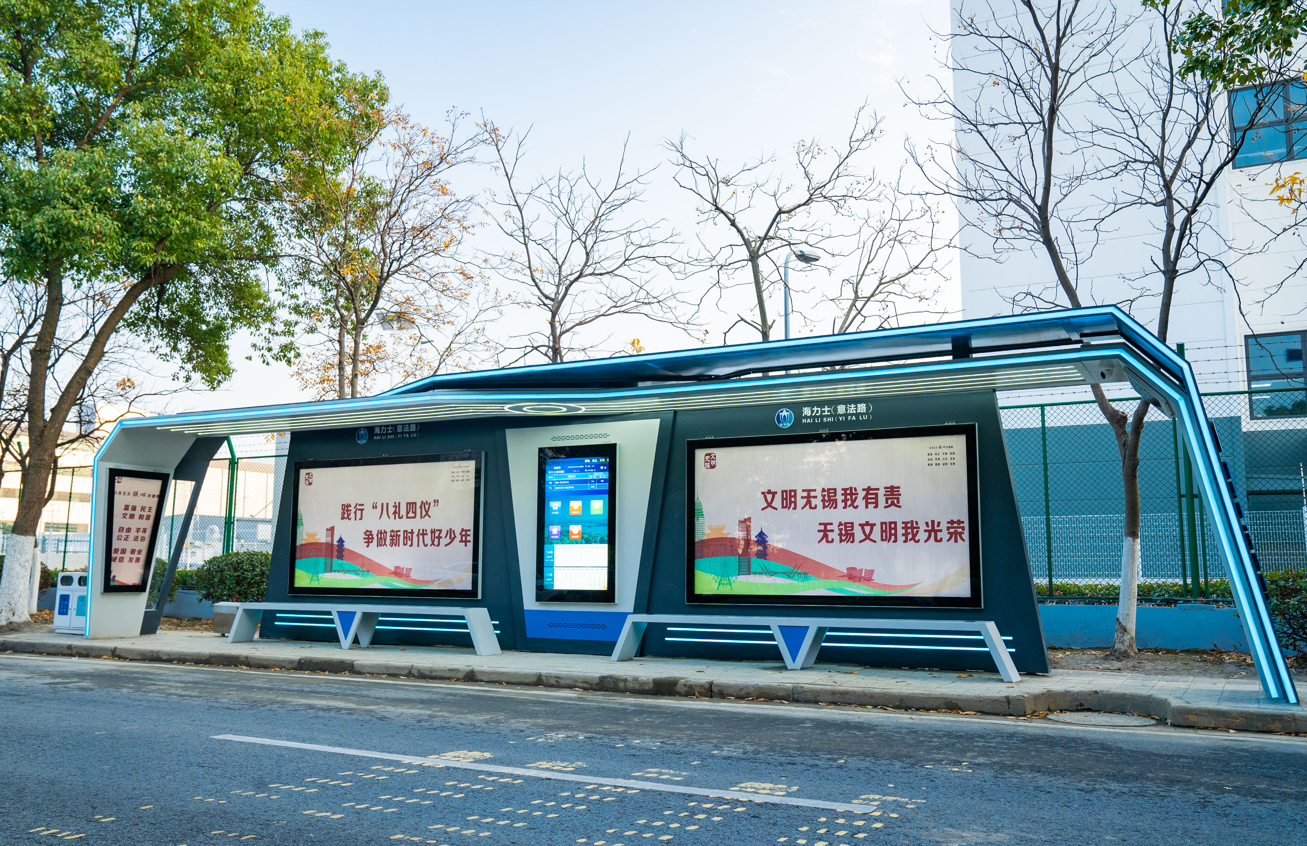 新吳區(qū)公交候車亭多是老式站臺,市民乘坐公交車候車體驗感差。在市民提出升級公交候車亭的訴求后,新吳區(qū)按照“統(tǒng)一規(guī)劃、分步實施”原則,啟動了數(shù)字候車亭項目建設(shè)和升級改造,打造了“一中心、雙平臺”(公交數(shù)據(jù)中心和智能調(diào)度平臺、內(nèi)控管理平臺)智慧公交系統(tǒng)。升級改造的數(shù)字候車亭配備LCD互動信息屏、手機無線充電、座椅加熱、AED(自動體外除顫儀)等功能,進一步提升了城市“顏值”,增強了群眾“出行幸福感”。截止2023年底,全區(qū)已投入使用120個數(shù)字公交候車亭、30個電子站牌,候車亭占站臺比達91%,電子站牌占比達44%。