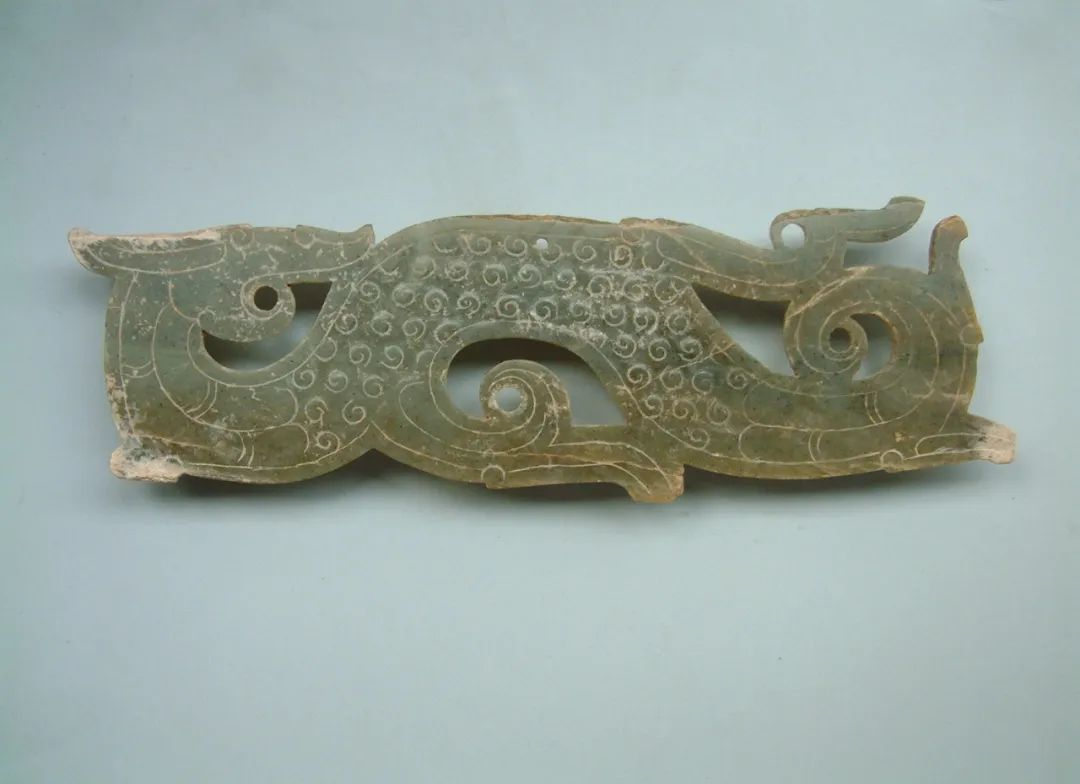 玉佩呈“S”造型,兩面透雕連體龍鳳。一端作回首龍形,龍身弧曲,背穿一孔。另一端為鳳紋,喙部連胸,鳳冠上翹,頸羽豐滿,作振翅欲飛狀。這種透雕龍鳳紋玉主要采用的是陰刻和透雕的手法,它的紋飾基本都是曲線,刀法凝練,線條流暢,從容自然。