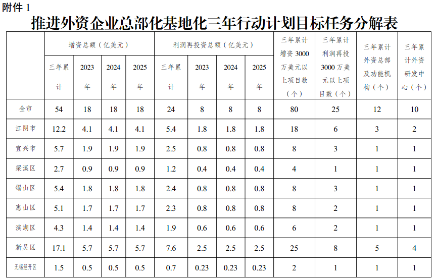 無錫市推進外資企業(yè)總部化基地化發(fā)展三年行動計劃(2023—2025年)