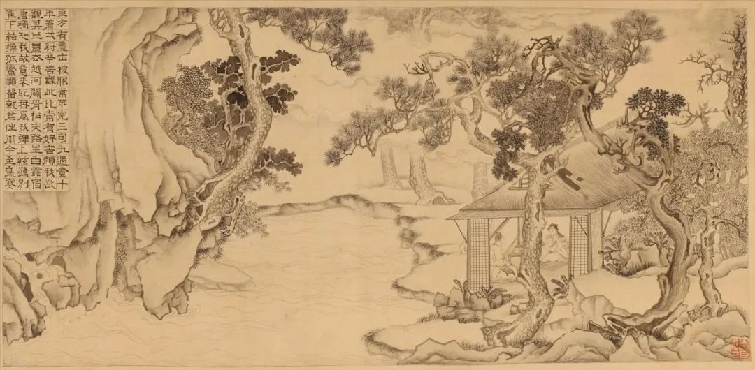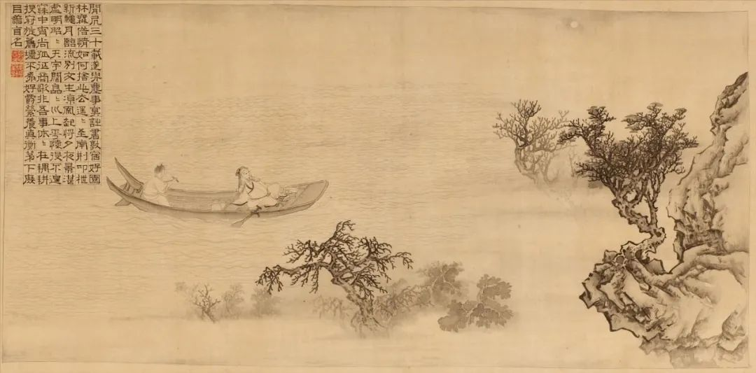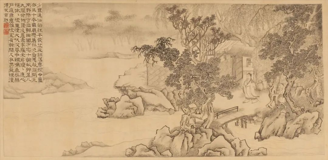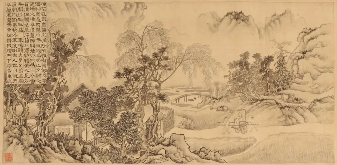 整卷分為四段,分別根據(jù)陶淵明《歸園田居•其一》《擬古九首•其五》《辛丑歲七月赴假還江陵夜行涂口》《歸園田居•其六》四首詩意而作,繪陶淵明持杖出游、訪隱聽琴、泛舟夜行、種苗歸園的情景。畫面中山石輪廓線較為粗重,棱角分明,皴染不多,有浙派筆意;而對(duì)人物、建筑的處理又頗為細(xì)致,筆觸細(xì)膩,清雋文雅,得吳門派之韻。全卷生動(dòng)刻畫了一位隱士悠然閑適的鄉(xiāng)居生活,詩情與畫意相融,古樸雋永,意蘊(yùn)悠長(zhǎng)。