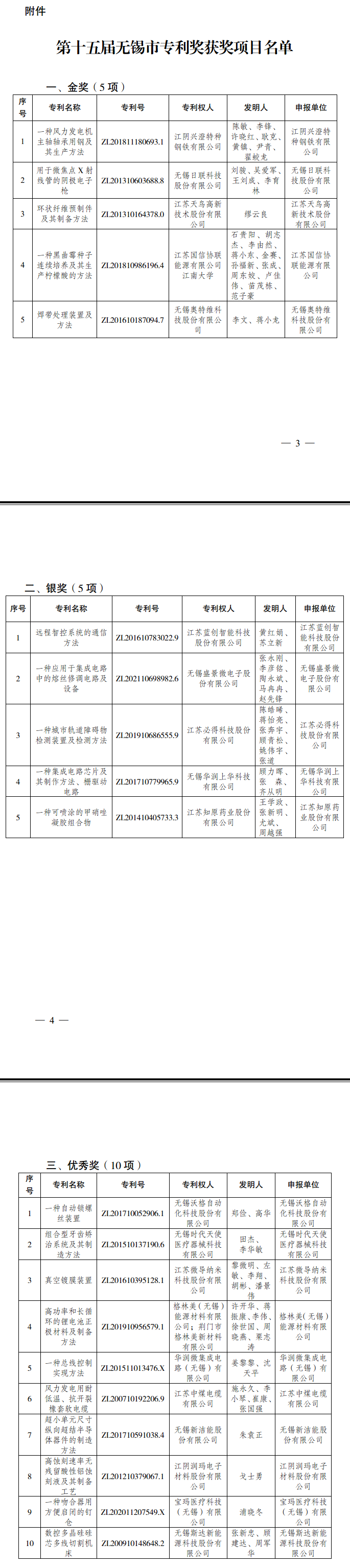 附件:第十五屆無(wú)錫市專利獎(jiǎng)獲獎(jiǎng)項(xiàng)目名單
