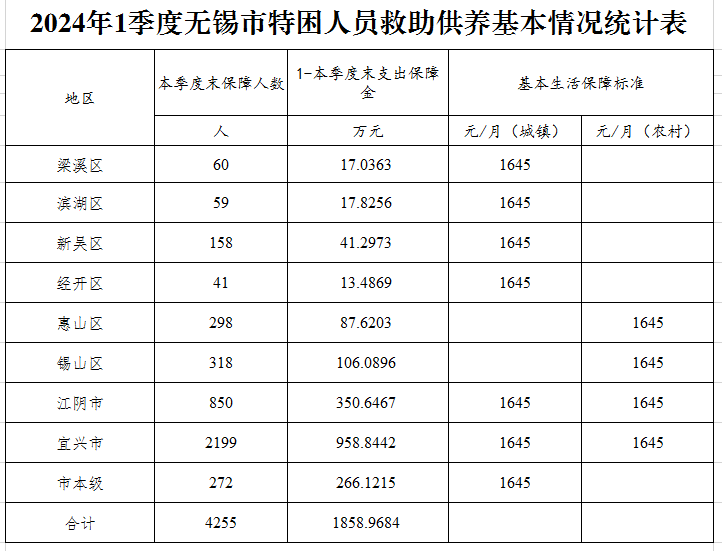 2024年1季度無錫市特困人員救助供養(yǎng)基本情況統(tǒng)計(jì)表