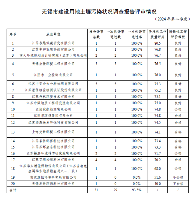 根據(jù)《無錫市建設(shè)用地土壤污染狀況調(diào)查從業(yè)單位工作質(zhì)量評價(jià)辦法(試行)》,我局對全市2024年第二季度建設(shè)用地土壤污染狀況調(diào)查報(bào)告評審情況進(jìn)行了匯總,相關(guān)情況公示如下: