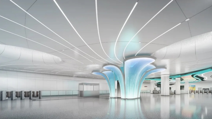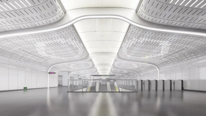 地鐵4號線二期無錫新區(qū)站,首次采用的大空間無柱設(shè)計是車站裝飾裝修最明顯的標(biāo)志。