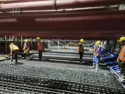 為確保首塊底板順利澆筑,建設(shè)團隊精心組織、周密部署人力、材料、機械等準(zhǔn)備工作,并實施24小時帶班制度,全方位推進(jìn)建設(shè)進(jìn)程。同時,建設(shè)團隊不斷優(yōu)化運輸路線并安排專人疏導(dǎo)交通,確保混凝土供應(yīng)及時無斷鏈,并且在澆筑過程中嚴(yán)格遵守操作規(guī)程,精確控制澆筑厚度與振搗間距,保障混凝土的密實度和整體質(zhì)量,共同推動底板澆筑任務(wù)順利完成。