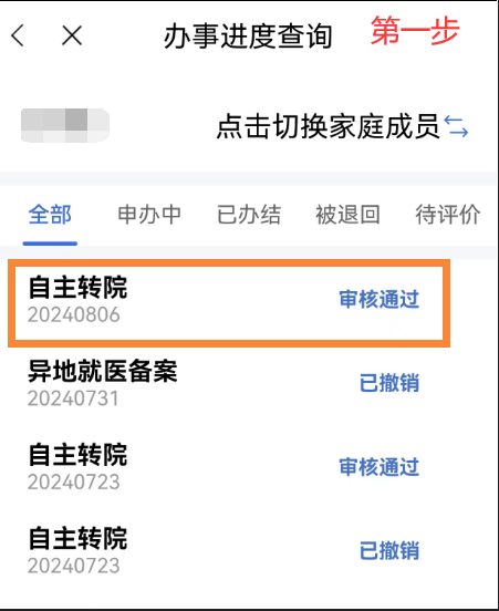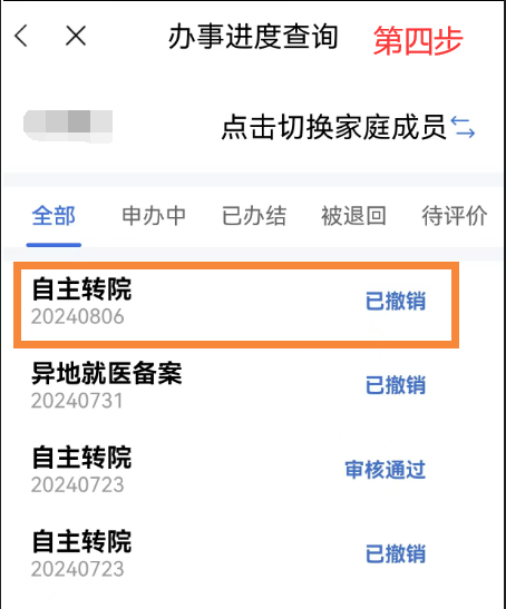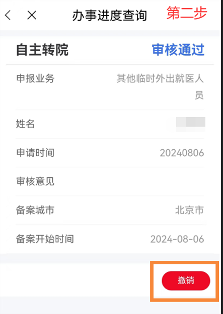 異地就醫(yī)備案成功后,點(diǎn)擊首頁(yè)【我要查】-【辦事進(jìn)度查詢】模塊,在【辦事進(jìn)度查詢】中選擇已審核通過(guò)的需要撤銷的備案信息,點(diǎn)擊【撤