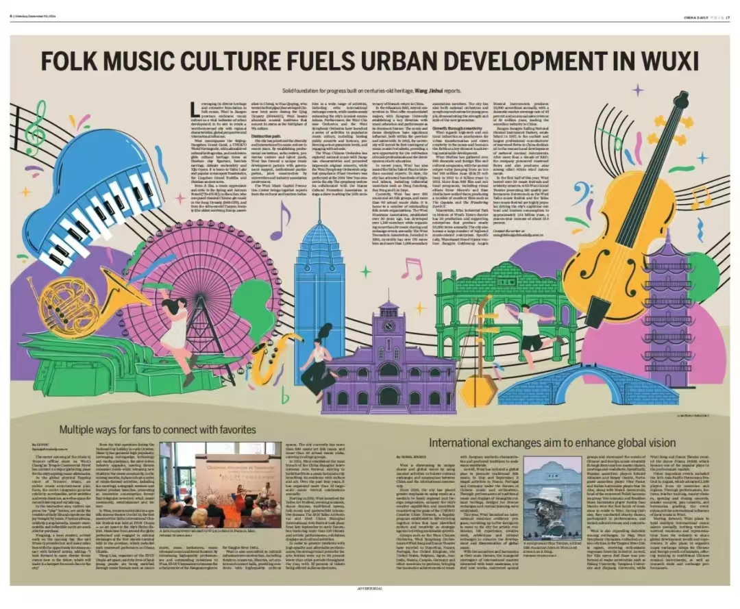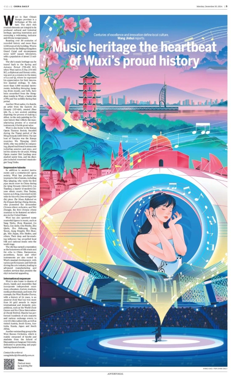 12月30日,《中國日報》刊發(fā)四聯(lián)版,以“千年音樂傳承,鑄就創(chuàng)新文化”為主題,借助原創(chuàng)手繪插畫等方式,從無錫燦若繁星的音樂名家、舉世聞名的樂器制造業(yè)、豐富多彩的民間音樂文化、頻繁多樣的中外文化交流等多角度,報道了無錫和音樂息息相關(guān)的故事?! ?/p>