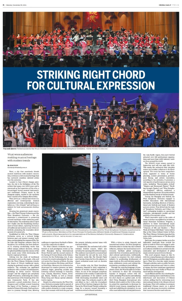 12月31日,中國香港歷史最悠久的中文財經(jīng)報章《香港商報》整版刊登4000字綜述《“愛樂之城”無錫:與時代共振 讓“太湖之聲”響徹全球》,從音樂文化交流、城市音樂空間打造、音樂產(chǎn)業(yè)躍升、音樂藝術(shù)普及、民樂品牌煥新五個維度詳述無錫作為“愛樂之城”,如何以音樂講述動人的城市故事,構(gòu)筑起與世界對話的橋梁。