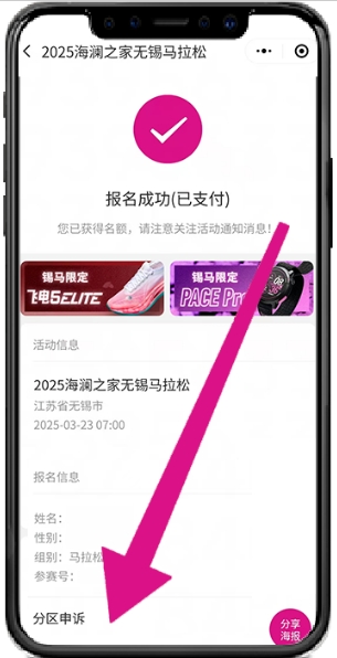 如果對自己的分區(qū)有異議,可在3月8日17:00之前,在錫馬「參賽助手」小程序「報名查詢」中的參賽號下方進(jìn)行分區(qū)申訴登記,我們將在復(fù)核無誤后調(diào)整。