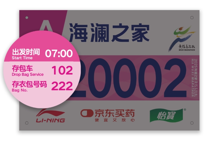 在分區(qū)字母和參賽號數(shù)字之外,號碼布中還將包含你的出發(fā)時間、存包車與存衣包號碼等更多的信息。錫馬的存包服務(wù)將面向馬拉松和半程馬拉松選手,比賽日,請按存包車編號前往對應(yīng)區(qū)域進(jìn)行存取包。別忘了,報到時領(lǐng)取的小號碼布,需要提前粘貼在你的存衣包上(劇透:今年的小號碼布是進(jìn)化版哦~)