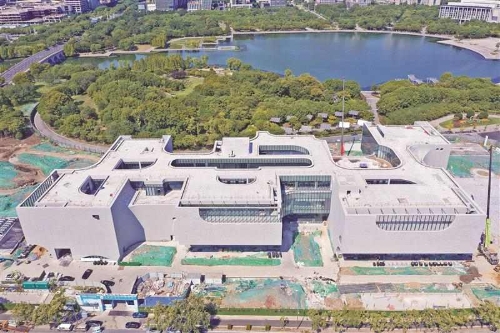 從空中俯瞰無錫美術(shù)館,其形似太湖石的建筑造型已躍然于尚賢湖畔。內(nèi)部設(shè)計也透露出濃厚的藝術(shù)氣息。