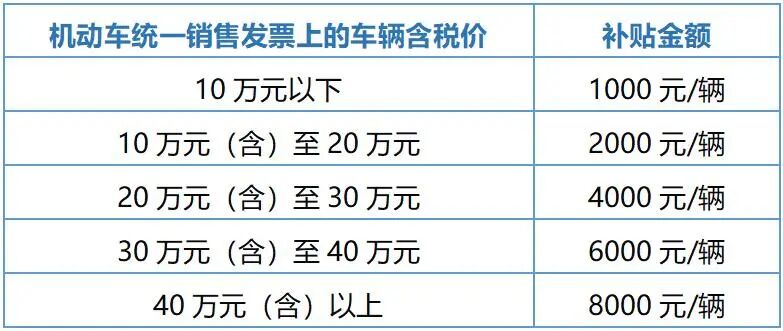 審核通過后,按機(jī)動(dòng)車銷售統(tǒng)一發(fā)票上的購(gòu)車價(jià)格(含稅價(jià)),分別給予一次性補(bǔ)貼。