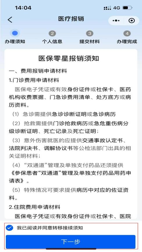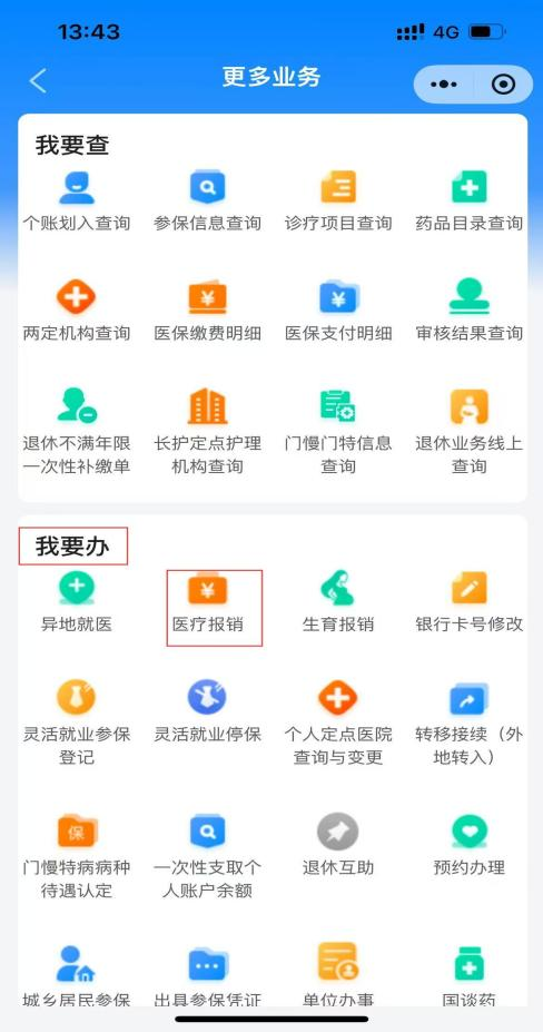 登錄個(gè)人賬戶(hù)后,點(diǎn)擊“更多”在“我要辦”模塊選擇“醫(yī)療報(bào)銷(xiāo)”,進(jìn)入報(bào)銷(xiāo)界面,勾選報(bào)銷(xiāo)須知后點(diǎn)擊“下一步”。