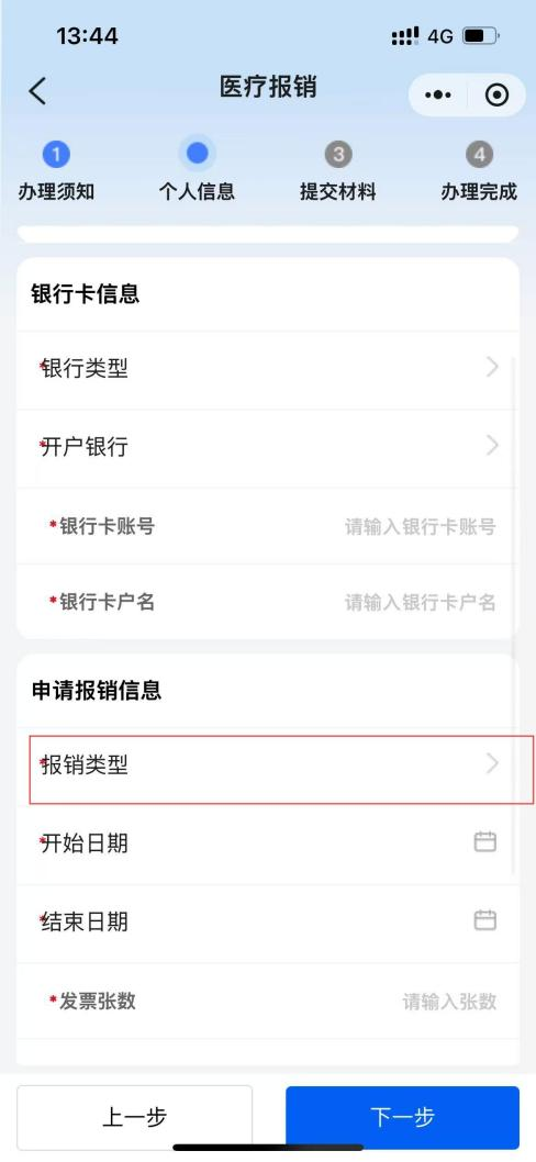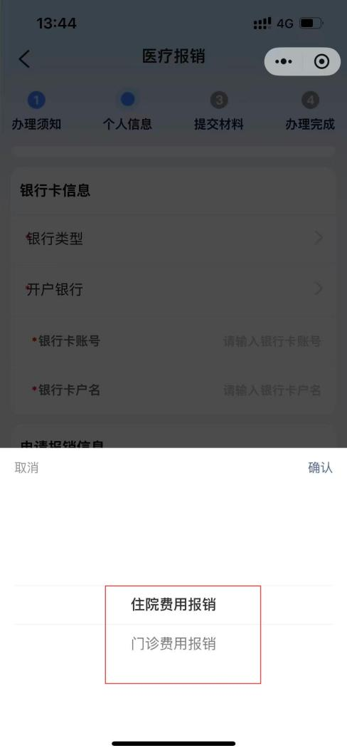 填寫(xiě)個(gè)人信息,報(bào)銷(xiāo)類(lèi)型可以選擇“門(mén)診費(fèi)用報(bào)銷(xiāo)”或“住院費(fèi)用報(bào)銷(xiāo)”。
