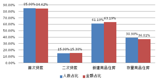 從貸款群體來看,剛需與改善型住房需求職工分別占貸款總人數(shù)的31.76%和61.36%。從單位性質來看,以城鎮(zhèn)私營企業(yè)及其他城鎮(zhèn)企業(yè)職工為主,貸款筆數(shù)和貸款金額占比分別為48.12%、46.05%。從購房面積來看,職工貸款購買小于90㎡、90-120㎡房屋居多,分別占貸款總人數(shù)的31.76%、37.24%。從主借人繳存基數(shù)來看,貸款主要以中、低收入職工為主,分別占貸款總人數(shù)的30.78%、67.04%。從貸款類型來看,純公積金貸款和組合貸款占比分別為51.07%、48.93%。從貸款結構來看,首次公積金貸款職工占貸款總人數(shù)的85%,第二次住房公積金貸款人數(shù)占15%,說明我市住房公積金貸款政策在保障剛需職工需求,體現(xiàn)住房公積金互助性方面發(fā)揮了較大的作用,住房公積金制度的初衷未改變。具體放貸結構如下: