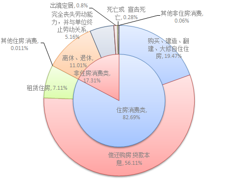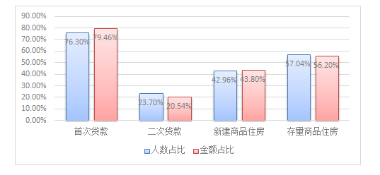 從貸款群體來看,剛需與改善型住房需求職工分別占貸款總人數(shù)的36.68%和54.83%。從單位性質(zhì)來看,以城鎮(zhèn)私營企業(yè)職工為主,貸款筆數(shù)和貸款金額占比分別為47.17%、46.28%。從購房面積來看,職工貸款購買小于90㎡、90-120㎡房屋居多,分別占貸款總人數(shù)的36.68%、31.71%。從主借人繳存基數(shù)來看,貸款主要以中、低收入職工為主,分別占貸款總人數(shù)的30.85%、67.41%。從貸款類型來看,純公積金貸款和組合貸款占比分別為47.43%、52.57%。從貸款結構來看,首次公積金貸款職工占貸款總人數(shù)的76.3%,第二次住房公積金貸款人數(shù)占23.7%。具體放貸結構如下:
