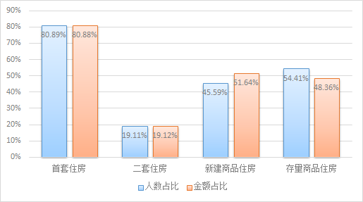 從貸款群體來看,剛需與改善型住房需求職工分別占貸款總人數(shù)的23.71%和59.91%。從單位性質來看,以城鎮(zhèn)私營企業(yè)及其他城鎮(zhèn)企業(yè)職工為主,貸款筆數(shù)和貸款金額占比分別為52.08%、52.9%。從購房面積來看,職工貸款購買90(不含)-120㎡房屋居多,占貸款總人數(shù)的43.3%。從主借人繳存基數(shù)來看,貸款主要以中、低收入職工為主,分別占貸款總人數(shù)的28.58%、70.69%。從貸款類型來看,純公積金貸款和組合貸款占比分別為78.44%、21.56%。從貸款結構來看,首套住房公積金貸款職工占貸款總人數(shù)的80.89%,二套住房公積金貸款人數(shù)占19.11%。具體放貸結構如下: